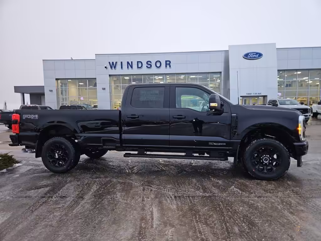 Introducing the 2026 Ford Super Duty F-350 SRW Lariat, a truck that embodies power and sophistication, now available at Windsor Ford in Grande Prairie. Dressed in a striking Agate Black Metallic finish, this SuperCrew truck is not just built for work; it’s designed for those who demand excellence in every drive.