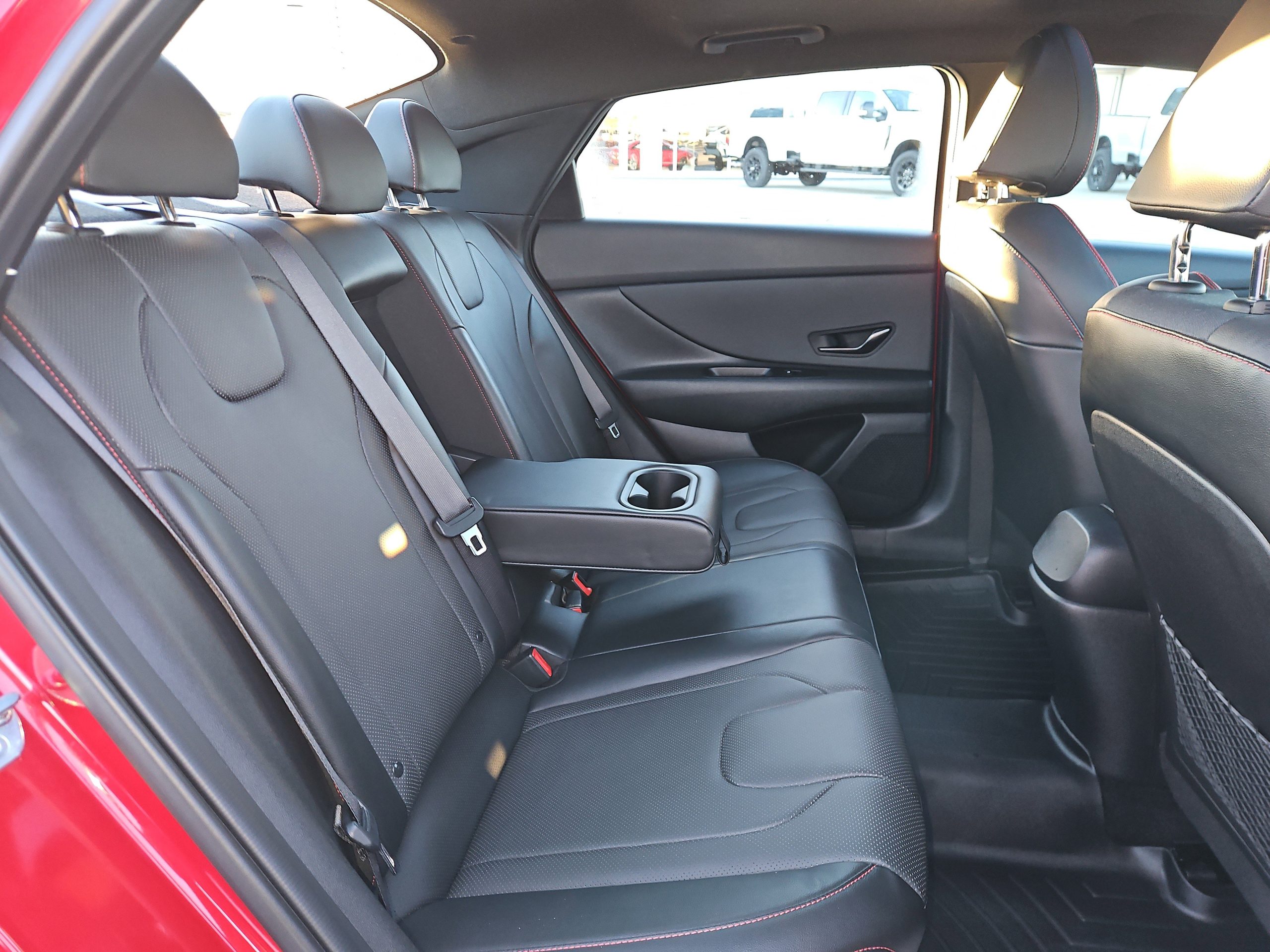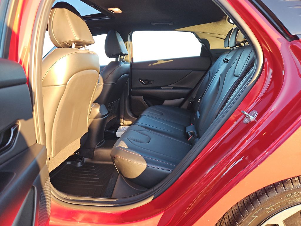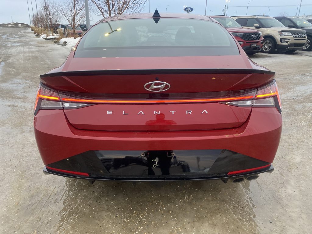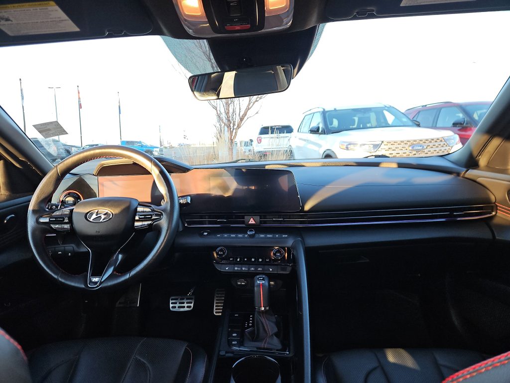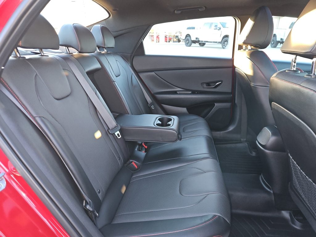 Step inside, and you’ll find a luxurious cabin adorned with black leather seating surfaces, complete with striking red stitching that adds a touch of flair. The multi-zone A/C and heated front seats promise comfort no matter the weather, while the premium sound system transforms every drive into a concert experience. Need to stay connected? The Elantra’s smart device integration and Bluetooth connectivity keep you in touch with what matters most.